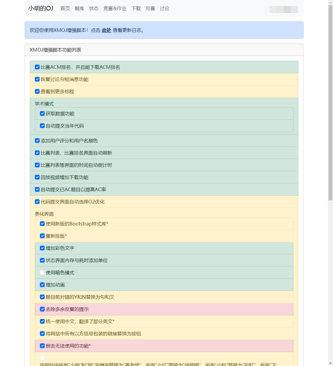 小明的OJ增强脚本 (XMOJ-Script) 在多个方面提供了有益的功能和改进。 首先,通过比赛ACM排名和下载功能,用户可以更方便地浏览比赛的排名情况,并且能够将相关信息下载以备离线查阅,这对于参赛者和观众来说都是一项实用的功能。 界面美化方面,采用新版的Bootstrap样式库、彩色文字和暗色模式等,能够显著提升用户界面的视觉吸引力和舒适度。